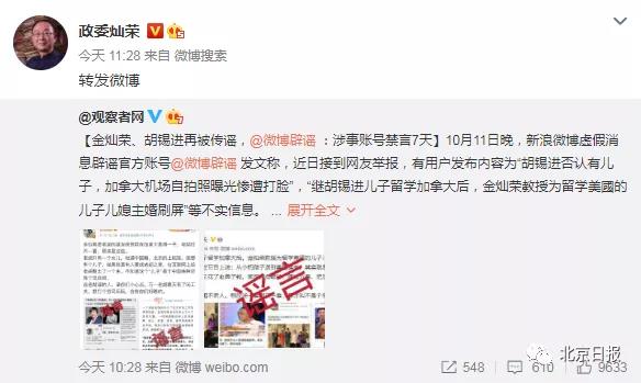 原标题:金灿荣、胡锡进被造谣,涉事账号被禁言7天!