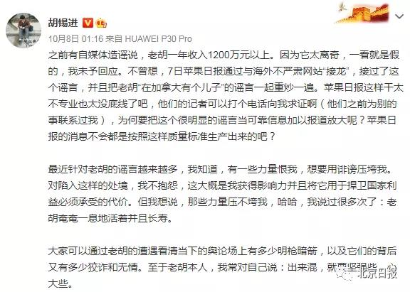 此类谣言此前也多次出现,《环球时报》总编辑胡锡进曾两次在微博中回应此事。他称自己“只有一个女儿,地道中国籍,北京的上班族。”并表示不会被这些诽谤他的力量压垮。