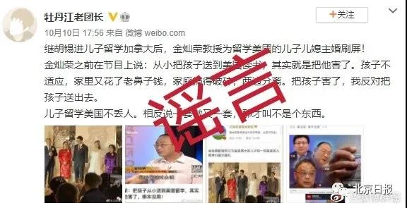近日有网友发布内容为“胡锡进否认有儿子,加拿大机场自拍照曝光惨遭打脸”,“继胡锡进儿子留学加拿大后,金灿荣教授为留学美國的儿子儿媳主婚刷屏”等不实信息。