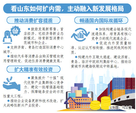 《中共山东省委关于制定山东省国民经济和社会发展第十四个五年规划和二〇三五年远景目标的建议》(以下简称《建议》)对此进行了突出强调和专章部署,“把实施扩大内需战略同深化供给侧结构性改革有机结合起来,以创新驱动、高质量供给引领和创造新需求,促进消费与投资协调互动、供给与需求动态平衡、国内市场与国际市场相互贯通”,并重点从三个方面探索融入路径。