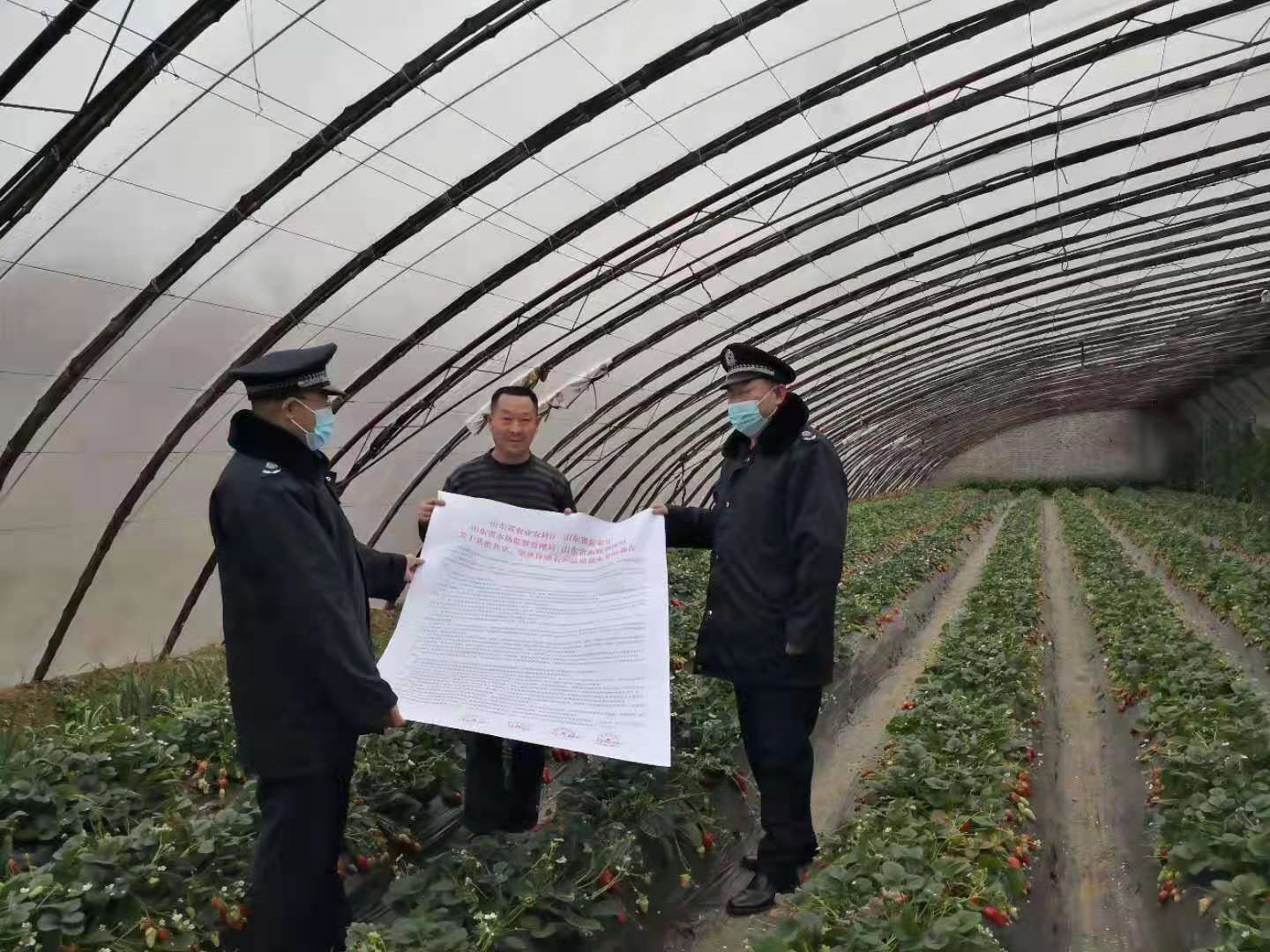 西海岸新区农业执法人员在草莓种植基地指导安全用药,提升农户科学种养水平
