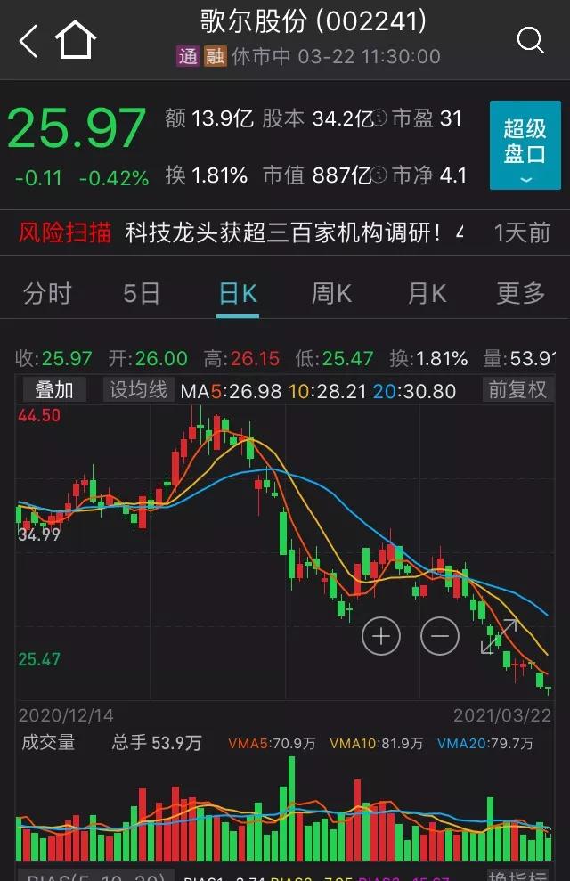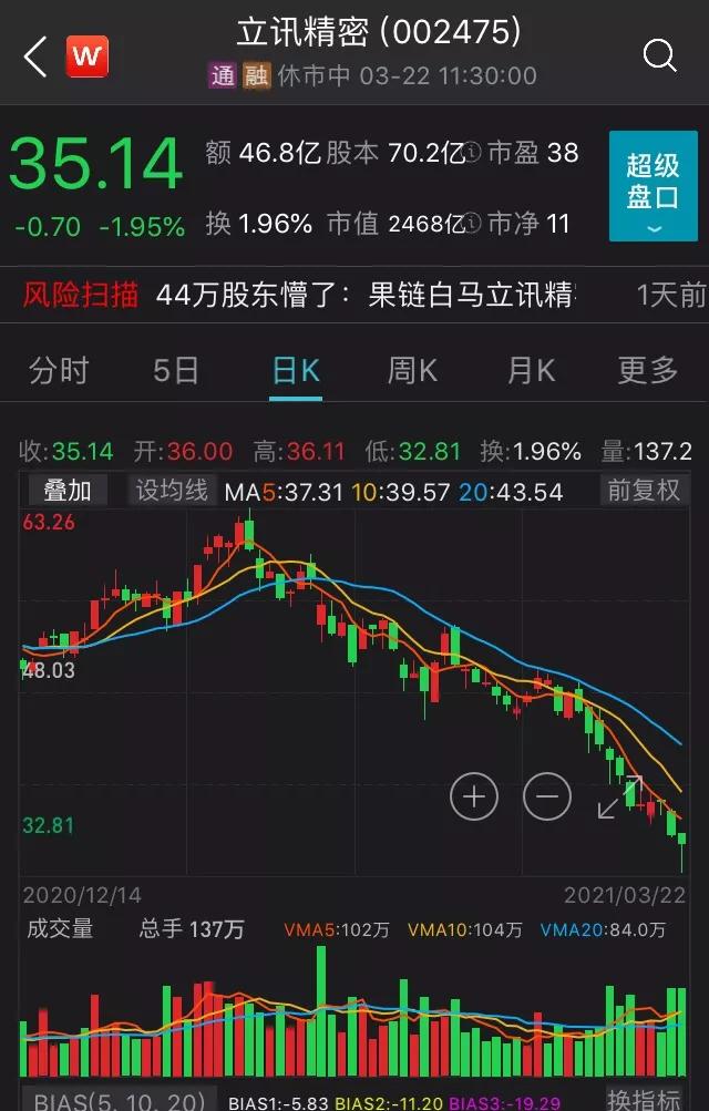 往前追溯,立讯精密在今年1月中旬股价最高超过63元。3月22日开盘后,立讯精密跌幅一度重挫8%至32.81元,截至午间收盘最新价35.14元,短短两多月时间大跌超44%。