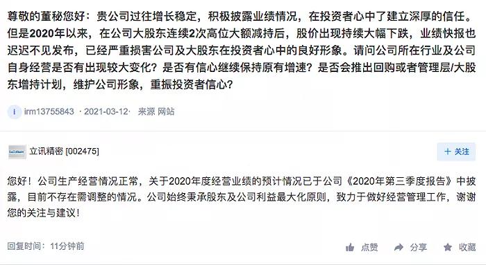 3月20日,立讯精密在互动平台上表示,公司生产经营情况正常,关于2020年度经营业绩的预计情况已于公司《2020年第三季度报告》中披露,目前不存在需调整的情况。公司始终秉承股东及公司利益最大化原则,致力于做好经营管理工作。