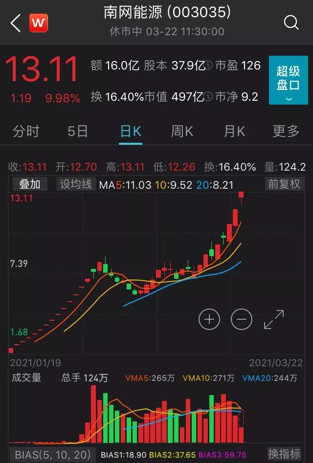 在本轮碳中和叠加次新股的概念当中,南网能源股价表现强劲,最近7个交易日连拉5个涨停,市值直逼500亿元。最新收盘价13.11元,较1.4元的发行价暴涨836%。