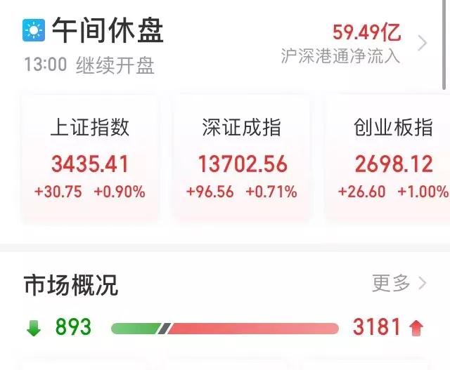 上午收盘,三大指数全线上涨,上证指数涨0.9%,深证成指涨0.71%,创业板涨1%。两市成交额4935亿元,个股大面积飘红,3181只个股上涨,893只个股下跌。上午北上资金大幅净流入,净买入59亿元。