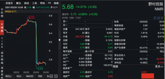 同日发布亏损公告的还有国际投行野村控股公司。野村控股表示,公司和一位美国客户的交易可能使野村美国的子公司遭受显著的亏损,根据3月26日的市场价格估算,亏损额有可能达20亿美元(约折合人民币130亿元)。野村控股美股周一跌14.07%。