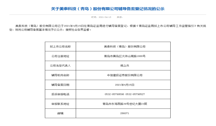 日前,美泰科技(青岛)股份有限公司(以下简称“美泰科技”)在青岛证监局进行辅导备案登记,辅导机构为中信建投证券股份有限公司。
