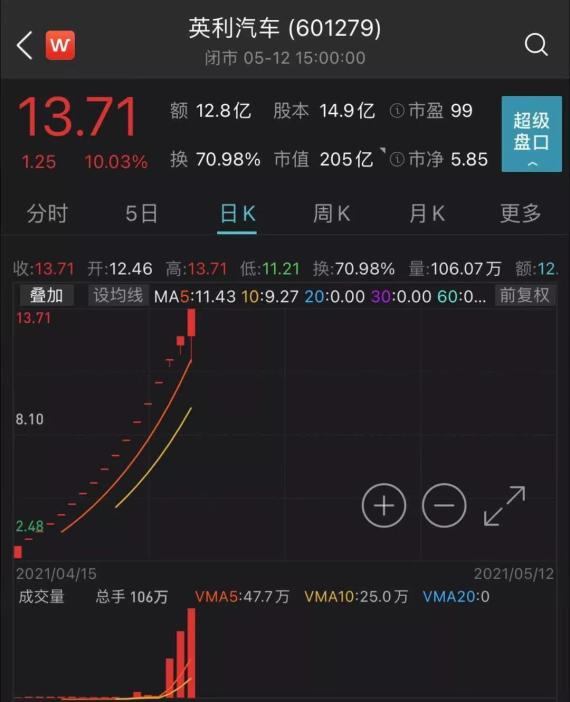 截至5月11日,英利汽车以惊人之势狂揽16个涨停板。