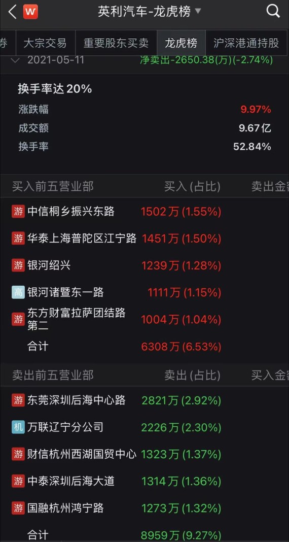 再如,中信证券桐乡振兴东路营业部于5月10日、11日分别买入1867万元、1502万元后,5月12日卖出2380万元。