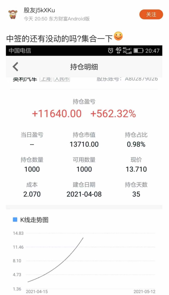 在连板行情之下,打新中签的股民显然大赚了一笔。有股民在股吧晒出了自己的交易软件截图。截图显示,该股民在中签1000股英利汽车股票后,截至目前一直没有卖出。而该股民最初的约2000元成本,在经过17个涨停后,已盈利11640元,大赚逾5倍。