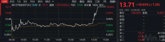 在当日约14:30,英利汽车果然没让大家失望,股价直线上涨,直奔涨停,最终报收13.71元/股,走出地天板行情。截至收盘,涨停封单逾41000手。