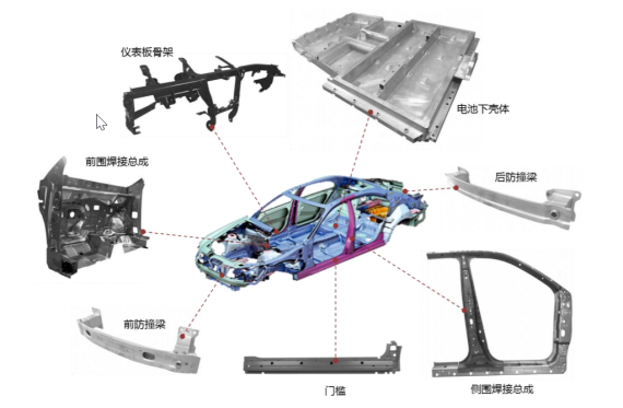 公司主要产品包含金属零部件和非金属零部件两大类。其中,金属零部件包括仪表板骨架、防撞梁、门槛、EV电池下壳体以及其他车身冲压件等。