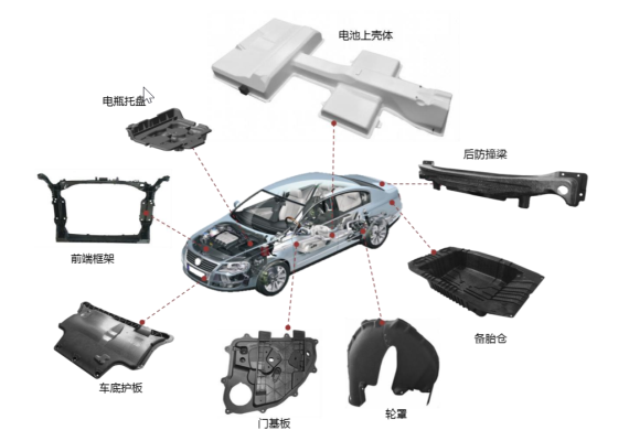 非金属零部件包括前端框架、车底护板、备胎仓、EV电池上壳体、电瓶托盘、轮罩等。