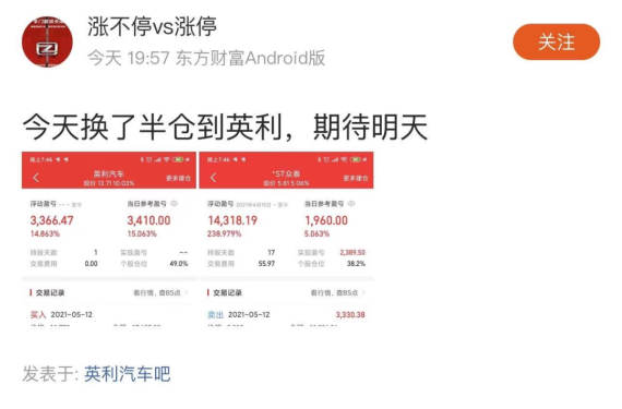 也有股民不惧高位风险,继续高价买入英利汽车。交易截图显示,该投资者在5月12日这一天卖掉*ST众泰后,调仓买入英利汽车。值得注意的是,*ST众泰从今年1月11日低位算起,截至5月12日,区间累计涨幅逾380%。