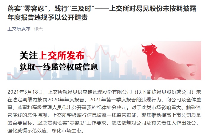 5月18日,上交所针对易见股份未按期披露年度报告违规予以公开谴责。这也是上交所上市企业中,唯一一家未在法定期限内披露2020年年报以及2021年第一季度报告的公司。