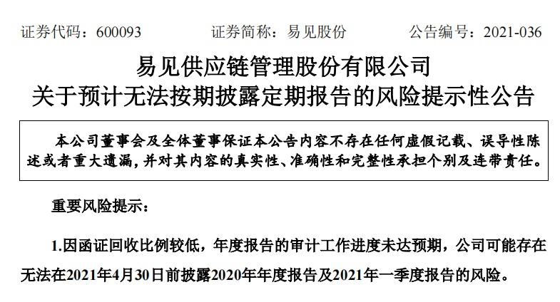 在4月28日午间,易见股份发布公告称,公司原定于4月30日披露2020年年报以及2021年第一季度报告,但由于公司多项会计科目函证回函比例较低,可能无法按期披露2020年年报以及2021年第一季度报告。