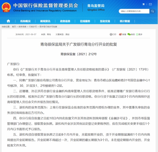 根据青岛银保监局对《广发银行关于青岛分行开业及高级管理人员任职资格核准的请示》的批复,具体内容为: