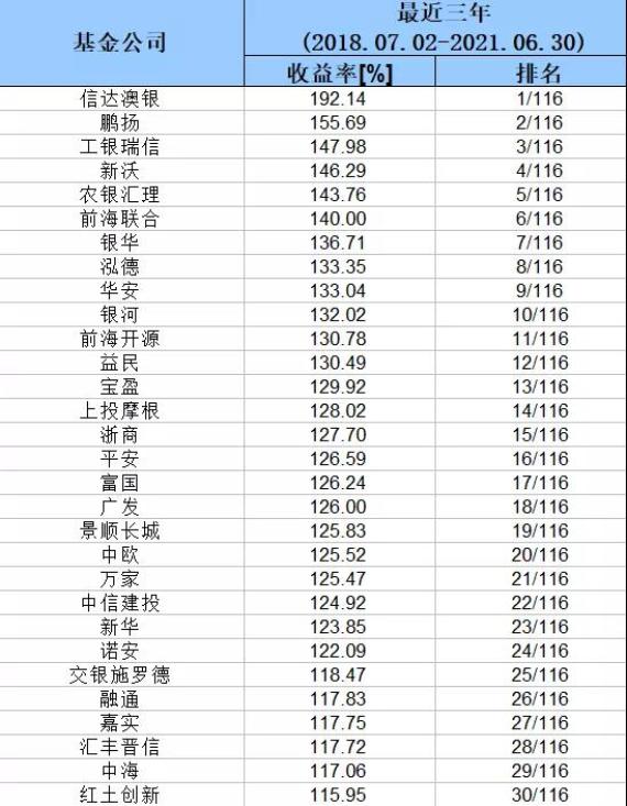 工银瑞信、新沃、农银汇理、前海联合、银华、泓德、华安和银河排名第三至第十,这些基金公司整体收益均超过132%。