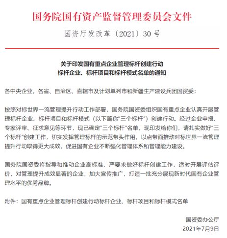 开展国有重点企业管理标杆创建行动,是国务院国资委深入贯彻落实国企改革三年行动部署,进一步发挥优秀企业示范带动作用,引领中央企业和地方国有重点企业对标世界一流管理提升行动走深走实的重要举措。今年3月,国务院国资委印发《关于开展对标世界一流管理提升行动的通知》明确提出,到2022年,国有重点企业基本形成系统完备、科学规范、运行高效的中国特色现代国有企业管理体系,企业总体管理能力明显增强,部分国有重点企业管理达到或接近世界一流水平。
