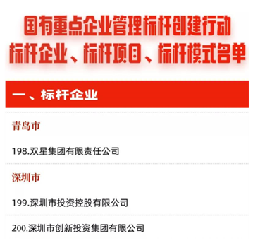 日前,国务院国资委组织开展国有重点企业管理标杆创建行动,公布了管理标杆企业、标杆项目和标杆模式(以下简称“三个标杆”)名单,双星集团凭借近年来搭建了系统完备、科学规范、运行高效的现代企业管理体系,入选国务院国资委国有重点企业管理标杆创建行动“标杆企业”名单,成为橡胶行业唯一一家入选该名单的企业,也是青岛唯一一家获此殊荣的地方国企。