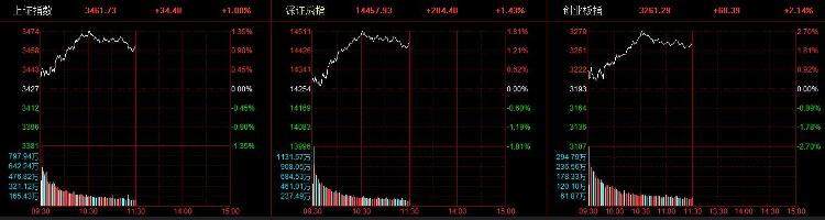 截至午盘,上证指数涨1%,报3461.73点,深证成指涨1.43%,报14457.93点,创业板指涨2.14%,报3261.29点。