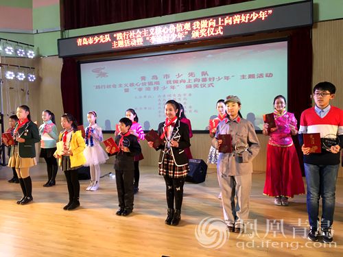 第二篇章是“践行社会主义核心价值观我做向上向善好少年”主题活动的启动和“李沧好少年”颁奖仪式。对100名李沧好少年颁发奖杯进行表彰,观看了王埠小学少先队员们围绕社会主义核心价值观自编自导自演的微电影。少先队员现场介绍了2016年李沧区少工委配合此项活动设计的争章手册和一至九年级的具体争章要求,并发出倡议,倡导全市少先队员努力学习践行社会主义核心价值观。