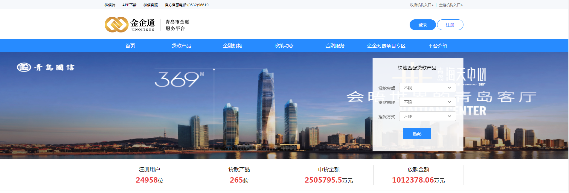 2020年6月,为深入贯彻落实中央关于金融服务实体经济的有关部署,更好地畅通中小微企业融资渠道,改善区域营商环境,面向中小微企业提供大数据征信、金融产品推荐和融资撮合等服务为一体的普惠金融服务平台,金企通平台正式上线运行。“面世”以来,平台在市地方金融监管局、市大数据发展局等部门的指导下以迅速行动、形成合力。截至目前,平台已汇聚工商银行、建设银行、青岛银行、青岛农商行等65家金融机构265款金融产品,24945家企业和个人用户注册登记,入驻机构服务人员共451人,持续为企业高效引入“金融活水”,切实解决民营企业和中小微企业融资难题。