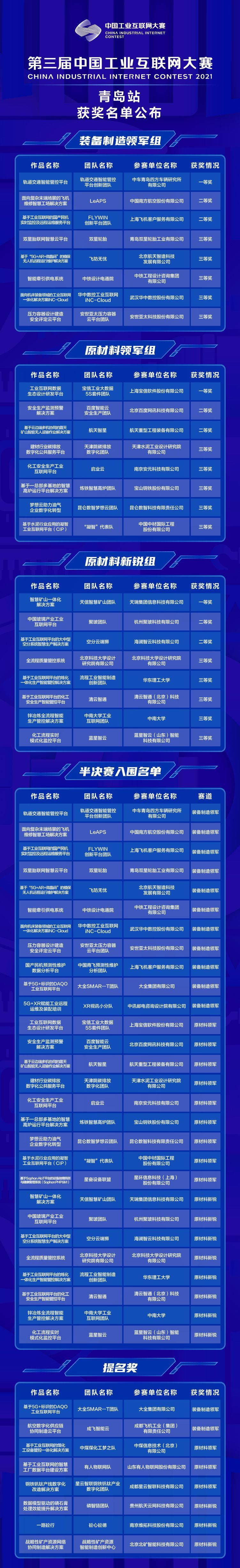 据了解,为切实发挥好“以赛促研、以赛促用”的作用,进一步加快工业互联网核心关键技术的创新突破,大赛青岛站结合区域产业发展特点,以提升企业数字化能力为主线,以解决行业共性难题为重点,对参赛的110个队伍进行严苛考核,最终评选出装备行业领军组和原材料行业领军组、新锐组各一、二、三等奖共24名和提名奖8名。