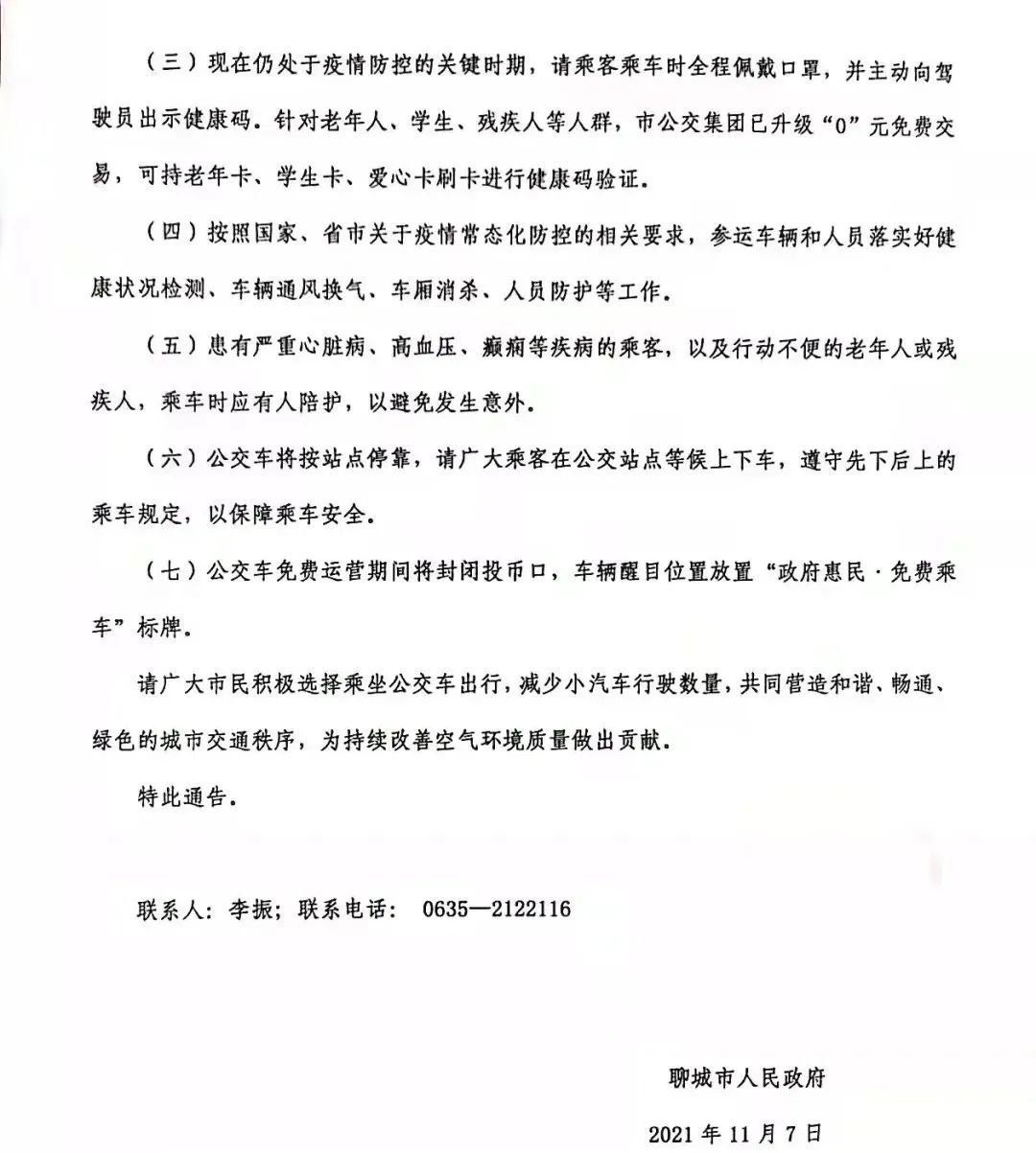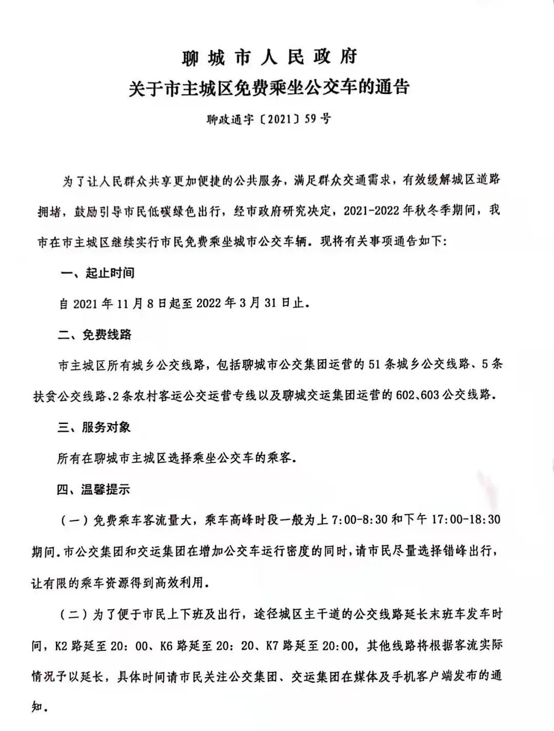 11月7日,聊城市人民政府发布通告,自11月8日起至明年3月31日,乘坐聊城公交的乘客全部免费,市民无须刷卡、无须投币,只需要佩戴口罩并出示电子健康出行码即可免费乘车。