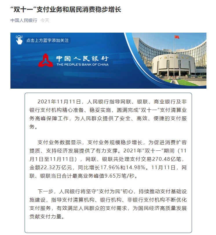 支付业务数据显示,支付业务规模稳步增长,为促进消费扩容提质、支持经济发展提供了有力支撑。2021年“双十一”期间(11月1日至11月11日),网联、银联共处理支付交易270.48亿笔,金额22.32万亿元,同比增长17.96%和14.98%。11月11日,网联、银联当日合计最高业务峰值9.65万笔/秒。