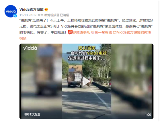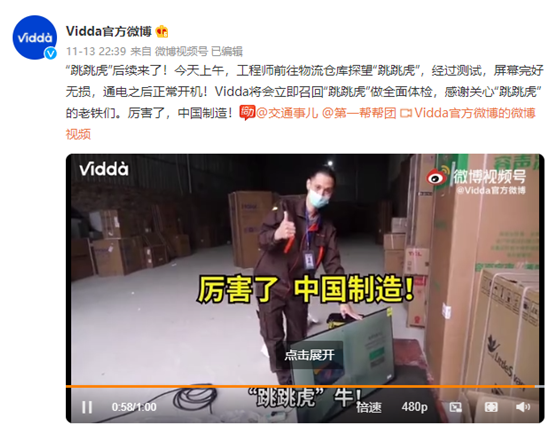 不过,11月13日晚间,Vidda官方微博的“后续报道”让网友们十分意外。这条微博里表示厂家人员注意到这条视频后,迅速通过各种渠道终于找到电视机,并派出工程师前往探视。经过工程师的现场检查,虽然包装和泡沫的四角有破损,但电视机本体安然无恙,而且通电之后正常点亮。目前,这台电视已被厂家召回做全面检查。