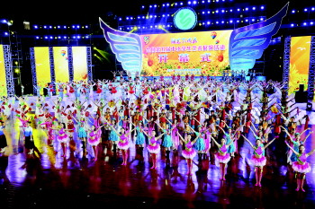 这是欢乐的聚会,这是艺术的殿堂。11日下午,全国第五届中小学生艺术展演活动在青岛国信钻石体育馆开幕。开幕式以弘扬中国梦为主旋律,演出分为“旭日”“同行”“成长”三个篇章,百名琴童合奏《璀璨青岛》给人带来艺术的震撼;根据青岛校园真实事件改编的音乐情景剧《爱心通道》,彰显赤诚师爱、学生亲师之情;极富动感和视听冲击力的行进管乐富有青春朝气;当台上台下千人同唱展演主题歌《阳光下成长》时,演出气氛达到了高潮,热烈的掌声经久不息。据了解,整场演出由岛城65所学校的3900余名师生参演,创造了参演人数和观摩人数的历史新高。