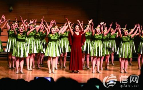 13日晚,青岛三十九中的师生早早到了现场备战,据该校的民族乐指导、常任指挥车红梅介绍,参赛的节目《飞春》是一曲民族管弦乐合奏,由65名中学生演奏者共同演奏,其年龄从初一到高二跨越五个年级,在此次展演的所有参演队伍中年龄跨度最大。《飞春》在去年6月4号第一次进行演出,8月上报山东省进行展演,经过师生在课余时间有计划地排练,最终在12月举行的全国五艺展的选拔中脱颖而出,来到现场展演。
