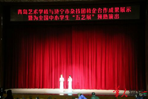 揭牌仪式后,青岛艺术学校举行了学校第十五届“无限春光”艺术教育成果展演。整台演出共分两部分:第一部分是为庆贺全国中小学生第五届艺术展演在青岛举行的预热演出,学校展示了在省市比赛中获奖的精品节目。第二部分是集团化办学、校企合作、现代学徒制成果展演,学校与校企办学单位:济宁演艺集团联袂演出了大型原创杂技剧《大哉孔子》,该剧采取段落式结构,将传统杂技艺术形式与歌舞等其他艺术形式有机融合在一起,意在演绎万世师表孔子从凡人升华为圣人的一生,表现了孔子以人为本,以和为贵,以忠孝为大,以智信为怀,以情意为天的思想精髓,带给观众全新的视觉艺术体验。全剧共有我校在籍学生 31人参入演出。