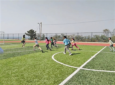昨日,黄岛区灵山岛小学体育场地开放后附近居民和孩子们在无敌海景操场上活动。