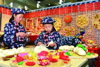 年味十足的剪纸窗花和卡花大馒头,川味浓郁的京剧脸谱和皮影表演,独特的土家族、维吾尔族、壮族刺绣纺织手艺……此次五艺展首次加入了学生艺术实践工作坊项目, 40个来自天南海北的工作坊,以其浓郁的地方特色,吸引了到场观众的目光。据了解,为在展演活动中进一步加强中华优秀传统文化教育和爱国主义教育,给农村地区小学生搭建展示平台,本届展演活动打破了以往小学生只参加第一、第二阶段活动,不参加全国现场展演的传统,新增了学生艺术实践工作坊项目。来自全国31个省(区、市)农村学校艺术教育实验县的小学生们,用实践体验、群体互动的展示形式,将浓郁的地方艺术特色和乡土元素在40个主题各异的工作坊中一一呈现。在广受关注的青岛展区,胶东文化特有的“年味”让人眼前一亮。整个展区以胶东大饽饽面塑艺术和崂山特色剪纸为主体,加上浓郁的农家装饰风格,凸显出地域民俗特色与传统文化的有机融合。在青岛人的传统习俗里,每逢佳节,家家户户都会蒸饽饽。通过这些大饽饽,让观众感受到独特的青岛民间文化;崂山剪纸的内容主要取材于崂山的民间故事和民俗风情,通过对传统剪纸技法进行大胆丰富和创新,反映了崂山人民朴素的时代道德观念和幸福生活新风貌。