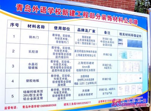 青岛九中新校区校门口的公示牌显示该工程严把装饰材料关
