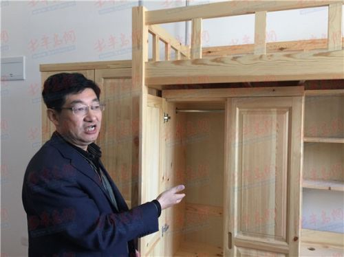 青岛六中党支副书记陈同法介绍学生公寓采用实木家具