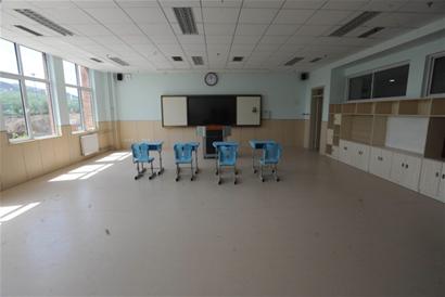 走进教学楼,记者看到工人们正在做初步的保洁,在教学楼二楼的一间教室样板间里,多功能黑板已经装好,讲台也已经摆好,教室里有4把课桌椅样品,教室侧面装着储藏柜,教室外边也有一排带锁的储藏柜,教室左后方还有一个洗手盆,方便学生洗手。走进教室时,记者使劲吸了几口气,并没有闻到装修材料的味道。