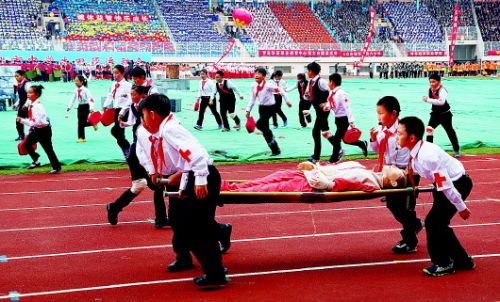 这是运动开幕式上最特殊的节目——学生的自救自护表演,由青岛市实验小学的两个班级,进行了模拟地震应急救护的情景剧表演,来自市内三区和崂山区的450名中小学生,则展示了更多的自救互救基本技能,由市南区实验小学完成的胸部包扎、市北区河西小学完成的头部帽式包扎、李沧区李沧路小学完成的双肩包扎、崂山张村河小学完成的前臂骨折夹板固定、青岛商务学校50名学生完成的心肺复苏技能展示,向观众展示中小学生红十字急救包的使用成果和中小学生日常所学习的红十字应急救护自救自护技能。