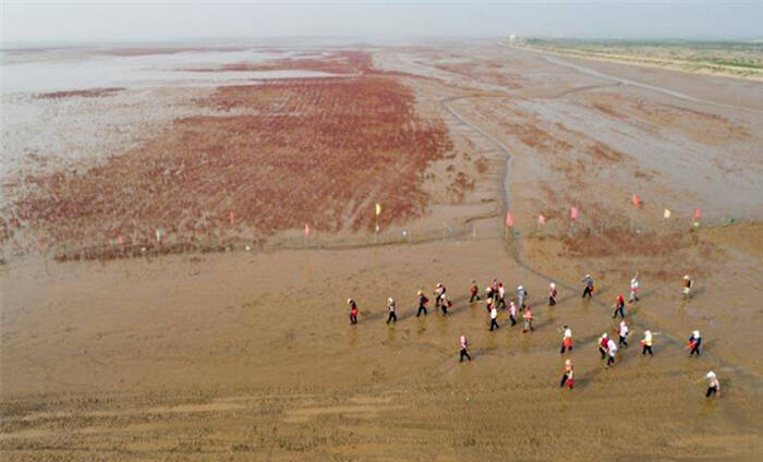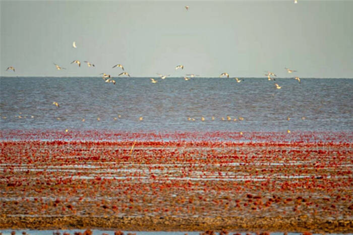 据了解,形成如此美丽景观的黄须菜,学名碱蓬,又名翅碱蓬、黄茎菜,自春至秋由绿变红。每年进入农历八月,都会迎来黄须菜一年中最红的季节。深红色碱蓬簇成的“红地毯”上空,一群群鸟儿不时掠过。鲜艳的“红毯”绵延不绝,其间或点缀绿色的芦苇,或停留驻足觅食的鸥鸟,处处洋溢着浪漫风情。