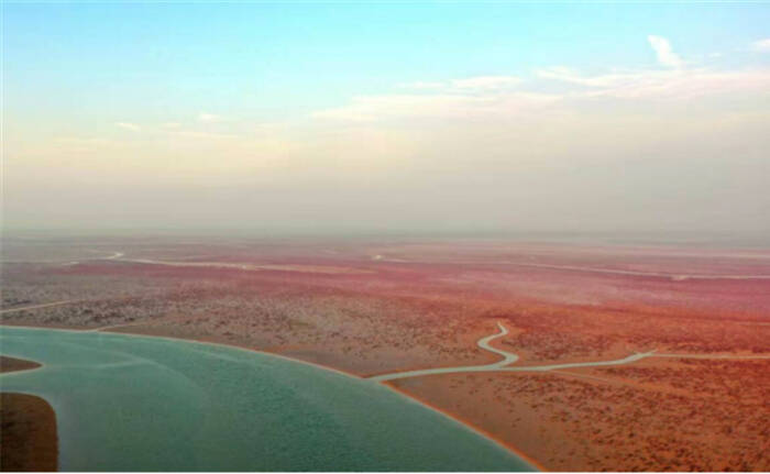 生态修复后,翅碱蓬自春至秋由绿变红,鲜艳的“红毯”绵延不绝,于光阴荏苒中,酿造出一片片火红的生命邑泽。流水布于红滩其中,更盈出水之芳华。