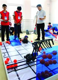 1.2米乘2.4米的模拟篮球场上,两台车型机器人分别从两侧起点出发,在选手的操控下,抓取“篮球”向“篮筐”投去,划出一条完美的抛物线后空心入网。在机器人狂飙投篮项目比赛现场,青岛实验初中的单连钧和冯书豪团队默契配合,联手奉上一场精彩的”篮球赛“。除了会投篮,外表冷冰冰的机器人还能演舞台剧,别看天生一张 “扑克脸”,举手投足可都是演技。表演的机器人外形类似收割机或挖掘机。 “本次比赛分为智能机器人竞赛和创客创新竞赛两大类别,共设14个竞技项目。”大赛组委会负责人、青岛市电化教育馆馆长秦新介绍说,为全面提升我市中小学师生的信息素养,培养创新人才,市教育局举行首届青岛市中小学信息技术创新与实践活动,搭建一个供全市中小学师生展示自我、实现创意的舞台。当天的比赛,学生们强烈的参与积极性和展现出的高竞技水平,说明我市在信息化背景下的教育教学模式综合改革已经取得了很好的效果,成果也很丰富。