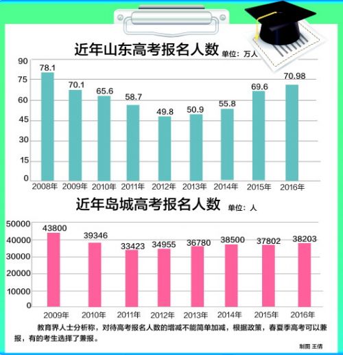 但教育界人士分析称,对待高考报名人数的增减不能简单加减,根据政策,春夏季高考可以兼报,有的考生选择了兼报。省教育厅表示,参加报名考生中已被单考单招、保送生录取43593人。对比青岛,报名人数也在增加,今年岛城有38203人参加夏季高考,而去年的人数是37802人,增加了401人。2014年青岛考生的数量是3.85万左右。2013年青岛夏季高考共有36780名考生参加考试,2012年夏季高考共有34955名考生参加统一文化课考试,2011年共有33423名考生参加统一文化课考试。2010年共有39346名考生参加夏季高考统一考试。2009年共有考生43800人参加夏季高考。