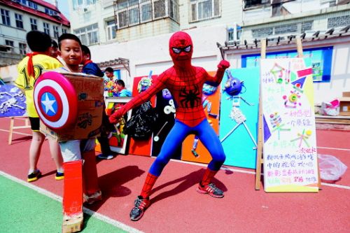 6月1日,文登路小学操场上,两名学生扮起“钢铁侠”、“蜘蛛侠”,参与儿童节主题活动。 本报记者 何毅 摄