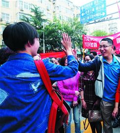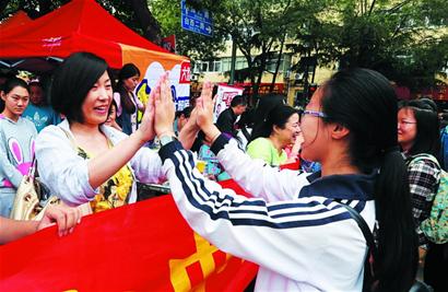 由于是第一门考试,早上8时30分考生们就陆续进场准备了。老师们和家长们给每一位考生击掌、拥抱后,目送他们进入1中教学楼才放心。看着时间还早,老师和家长们开始提前“庆祝”了。老师们也抓住这难得的机会,各科任课老师聚在一起,以各个学校的横幅为背景拍了一张集体照。