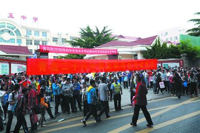 端午假期还未结束,中考拉开帷幕。昨日是端午假期最后一天,各考点出现了大量的家长陪考,在15中考点外,比高考还要拥挤。记者在现场看到,两名家长举起红条幅,上面写着“青岛28中祝全体考生考试成功”。举横幅的家长唐先生告诉记者,这个横幅是学校制作的,七八个家长义务轮流举着,不到8时就开始了,不仅给自己的孩子加油打气,也给所有的考生讨个好彩头。在青岛2中考点,5中学生家长陈女士也告诉记者,家里已经是全家出动。“第一天是假期,第二天、第三天我都请假了,这么关键的时候不送送哪能放心。今天孩子爸爸也来了,往后几天我自己来送。 ”陈女士说。