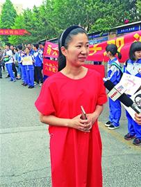 在66中门口,青岛超银中学的老师们穿着统一的红色T恤衫前来送考,“红色比较醒目,站在送考人群中,我们的孩子一眼就看到我们了;另外也是希望孩子们的中考成绩能红红火火。”超银中学潘校长告诉记者。