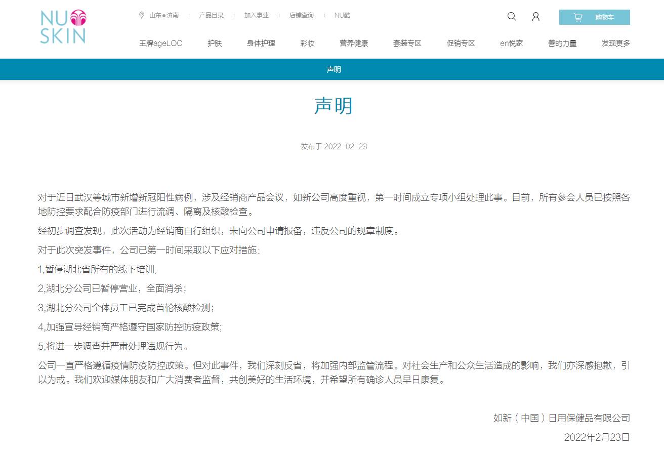 2月23日,如新(中国)官网再发声明:对于近日武汉等城市新增新冠阳性病例,涉及经销商产品会议。此次活动为经销商自行组织,未向公司申请报备,违反公司的规章制度。公司对社会生产和公众生活造成的影响深感抱歉。