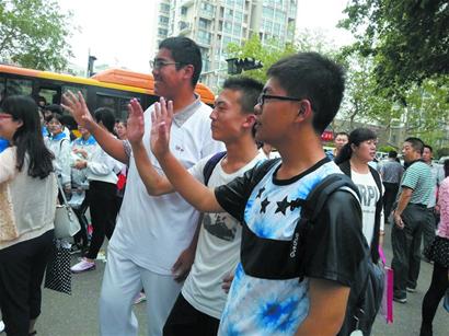 在青岛58中考点外,来自63中的王震穿着58中校服,跟前来考试的同学热情击掌,1.92米的大个子在人群中特别显眼。他已经自招进了58中,这次来送考,同学们看到他都挺振奋。 “好长时间不见你了,干什么去了? ”“你享受超长假期去了?”对此,王震笑称并没有什么超长假期,自己倒是忙得不得了。